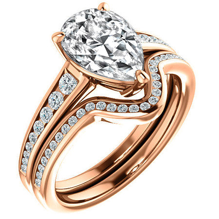 This beautiful engagement ring features a pear cut colorless Moissanite center stone and 0.24cts of channel-set VS, E/F quality diamond side stones, set in your choice of 14k gold, 18k gold or platinum.