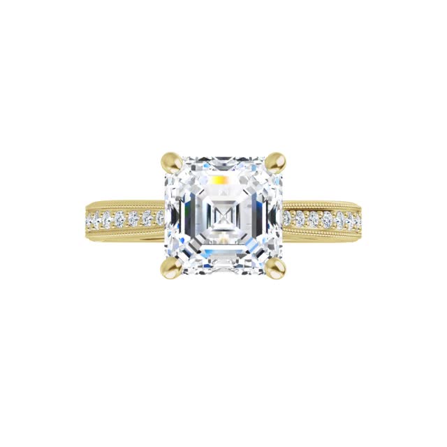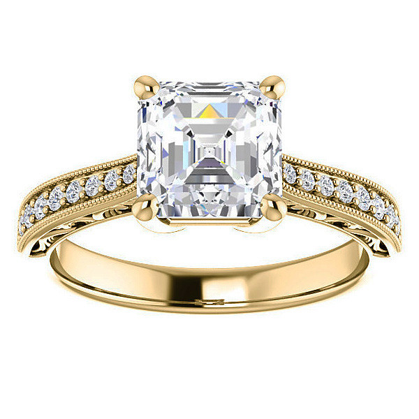 This beautiful engagement ring features a hand engraved design with milgrain, an asscher cut colorless Moissanite center stone, and 0.16ct of Moissanite side stones, set in your choice of 14k gold, 18k gold or platinum. Add the optional matching band to make it a complete set.