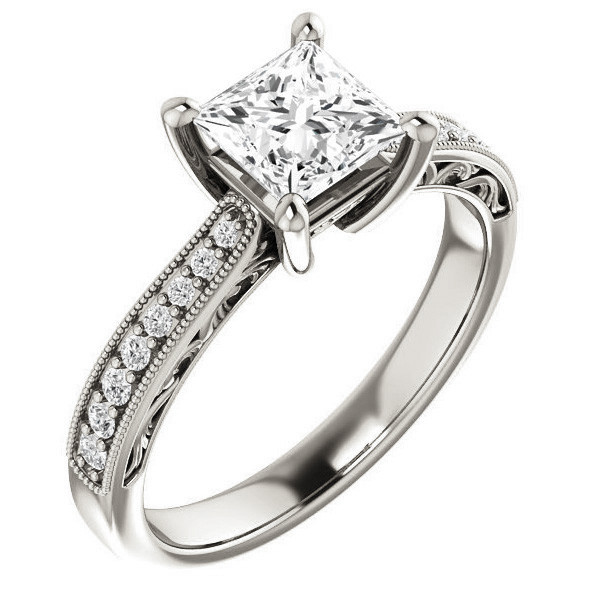 Featuring Milgrain, Antique, Etched and Side Stones from our Engagement Rings collection. Model #enr138-pr is available in 27 brilliant center stone options, 1 fine sidestone option, and your choice of 6 eco-friendly precious metals.