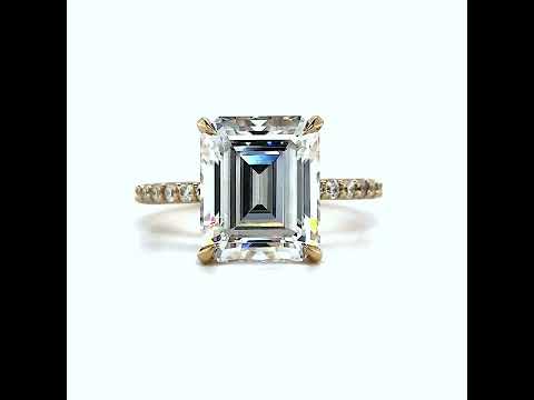 At the heart of this captivating setting, you'll find an emerald or radiant cut Moissanite center stone, handpicked to your desired specifications of size and quality. Embraced by four delicately shaped claw prongs, the center stone takes center stage, radiating brilliance and capturing attention with its mesmerizing allure.