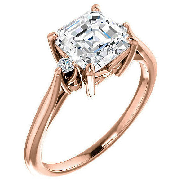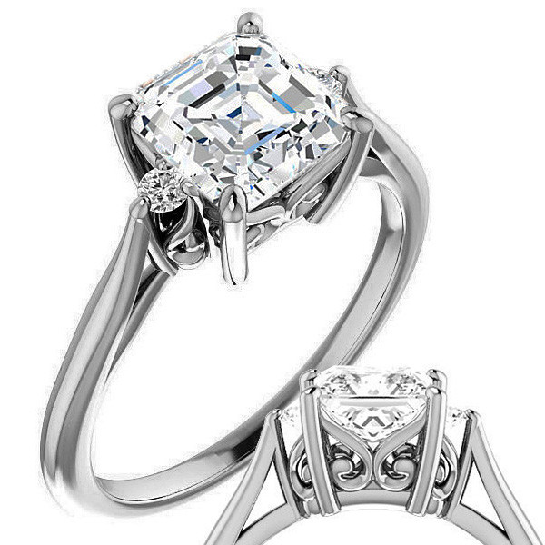 This beautiful engagement ring features a cathedral design with an asscher colorless Moissanite center stone and two smaller round cut colorless Moissanite side stones (0.10 - 0.30ct). Available in your choice of 14k gold, 18k gold or platinum.