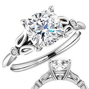 This beautiful engagement ring features a cathedral setting with a floral design, a cushion cut Moissanite center stone and diamond side stones, set in your choice of 14k gold, 18k gold or platinum. The band measures approximately 1.8mm in width.
