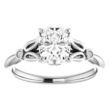 This beautiful engagement ring features a cathedral setting with a floral design, an oval cut colorless Moissanite center stone and VS, E/F quality diamond side stones, set in your choice of 14k gold, 18k gold or platinum. The band measures approximately 1.8mm in width.