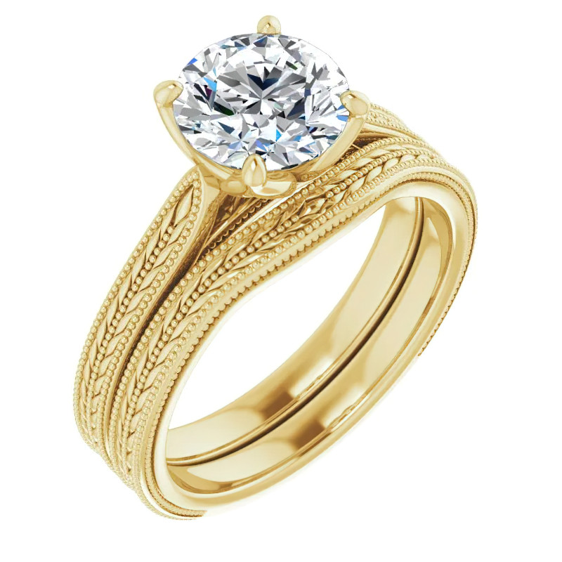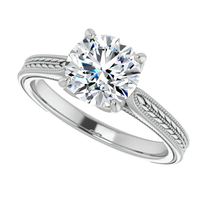 This beautiful solitaire ring features a vintage design with milgrain accents, a round brilliant cut colorless Moissanite center stone set in tulip-styled prongs, and is set in your choice of 14k gold, 18k gold or platinum. Add the optional matching band to make this a complete set.