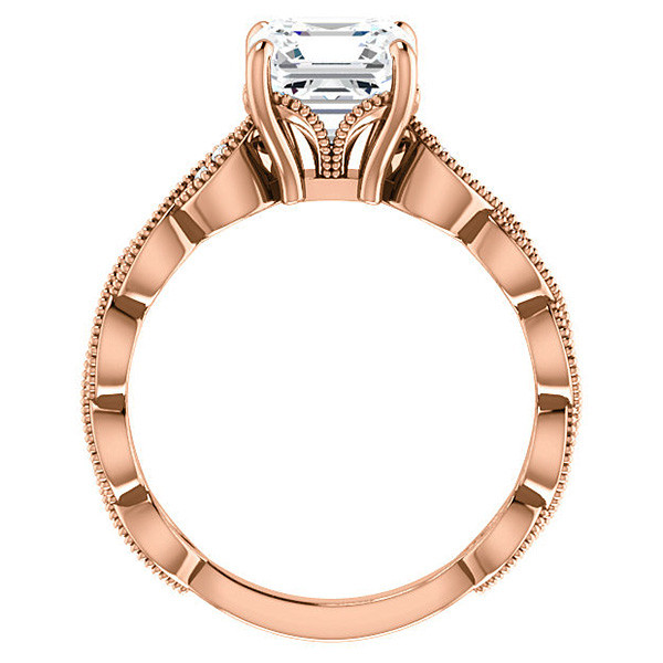 This beautiful engagement ring features an infinity styled design with milgrain accents, an asscher cut colorless Moissanite center stone, 0.10cts of round brilliant Moissanite side stones, and is set in your choice of 14k gold, 18k gold or platinum. Add the optional matching band to make it a complete set.