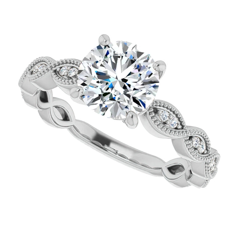 Featuring Milgrain, Infinity, Antique, Side Stones and Scalloped Band from our Engagement Rings collection. Model #enr144 is available in 68 brilliant center stone options, 1 fine sidestone option, and your choice of 5 eco-friendly precious metals.
