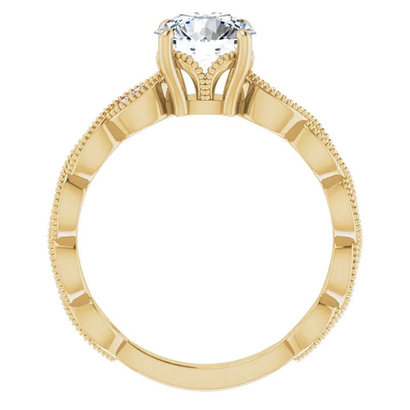 This beautiful engagement ring features an infinity styled design with milgrain accents, a round brilliant Moissanite center stone, 0.10cts of diamond side stones, and is set in your choice of 14k gold, 18k gold or platinum. Add the optional matching band to make it a complete set.