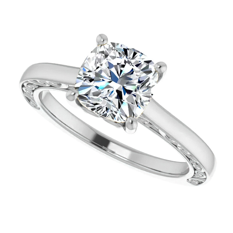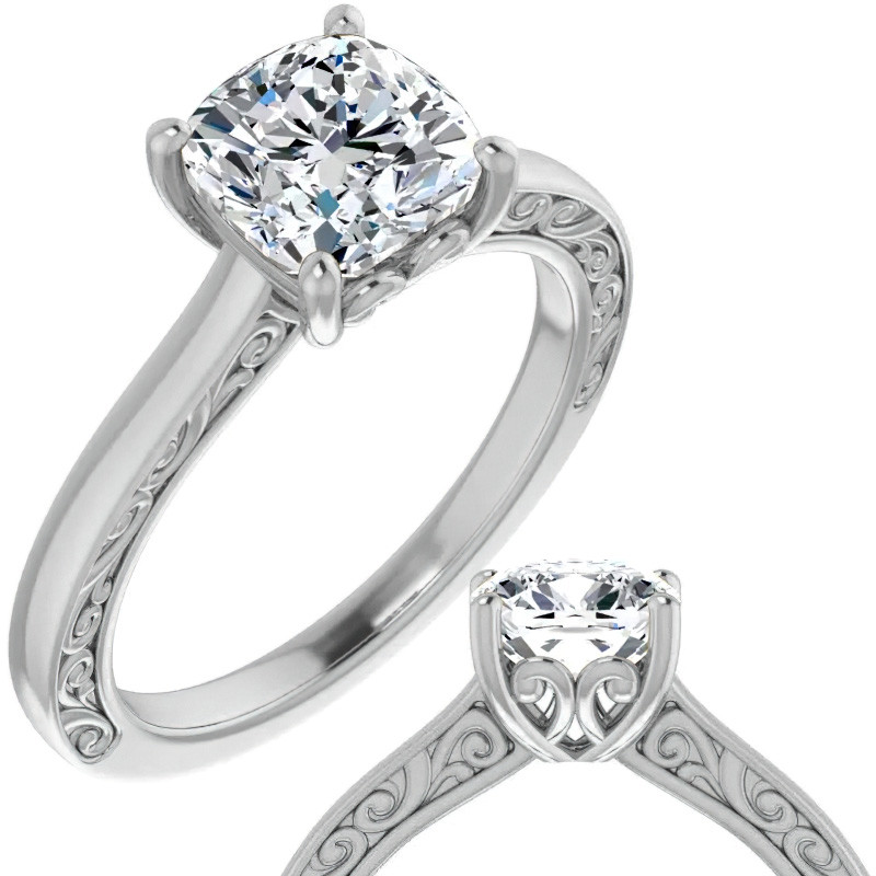 This beautiful engagement ring features a scroll accented design with a cushion cut Moissanite center stone, set in your choice of 14k gold, 18k gold or platinum. Add the optional matching band to make it a complete set.