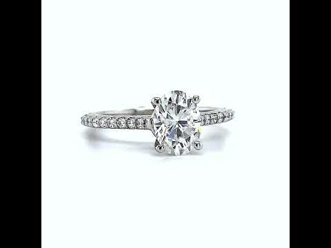 At the heart of this magnificent ring lies a captivating oval cut Moissanite center stone, radiating brilliant fire and unparalleled sparkle. Complementing the center stone are 0.20ct of round brilliant Moissanite side stones, adding a mesmerizing effect to this already dazzling piece.