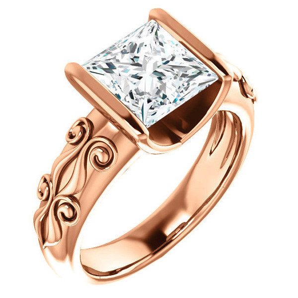 This beautiful engagement ring features a modern style design with scroll accents, a princess cut colorless Moissanite, and is set in your choice of 14k gold, 18k gold or platinum.
