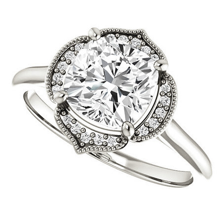 This beautiful engagement ring features a petite halo floral design with milgrain accents, a cushion colorless Moissanite center stone, and 0.04 - 0.09cts of diamond side stones, set in your choice of 14k gold, 18k gold or platinum.
