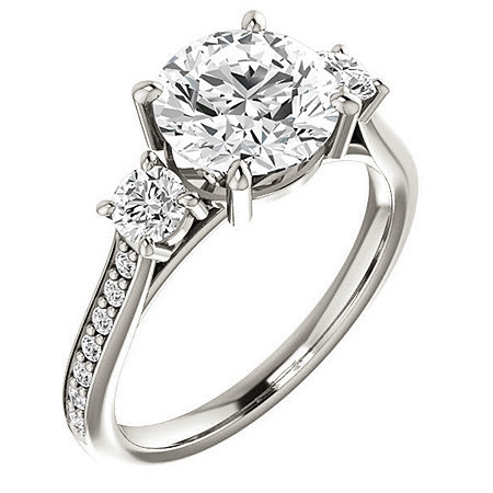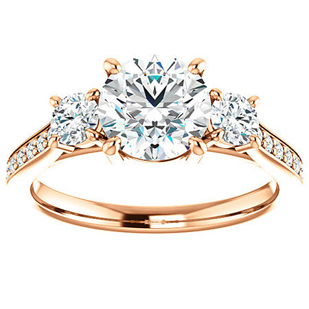 This beautiful three-stone engagement ring features a cathedral design, a round brilliant cut colorless Moissanite center stone with two smaller round brilliant cut Moissanite side stones, and 0.16ct of round brilliant Moissanite side stones in 14k gold, 18k gold or platinum.