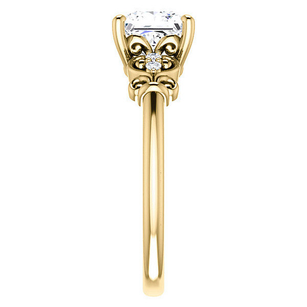This beautiful engagement ring features a delicate scroll design, set with an asscher cut colorless Moissanite center stone, 0.05ct of round brilliant Moissanite side stones, and is available in your choice of 14k gold, 18k gold or platinum.