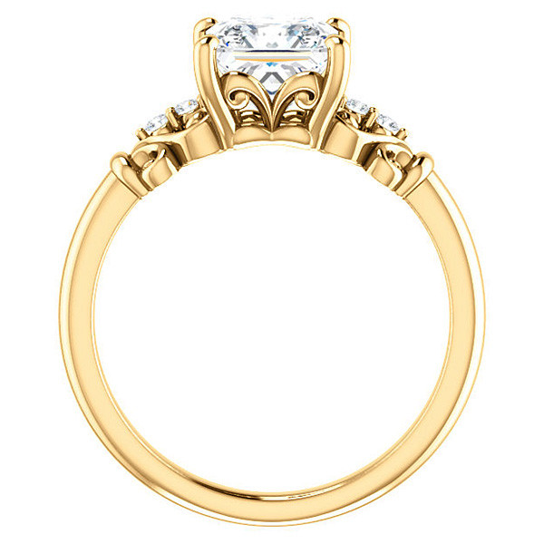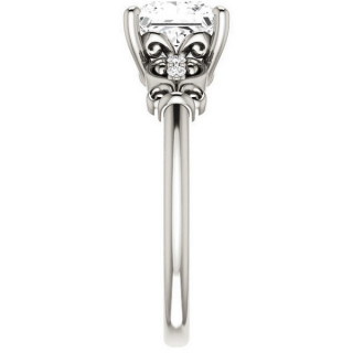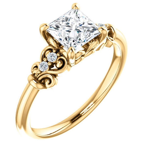 This beautiful engagement ring features a delicate scroll design, set with a princess cut colorless Moissanite center stone, 0.05ct of diamond side stones, and is available in your choice of 14k gold, 18k gold or platinum.