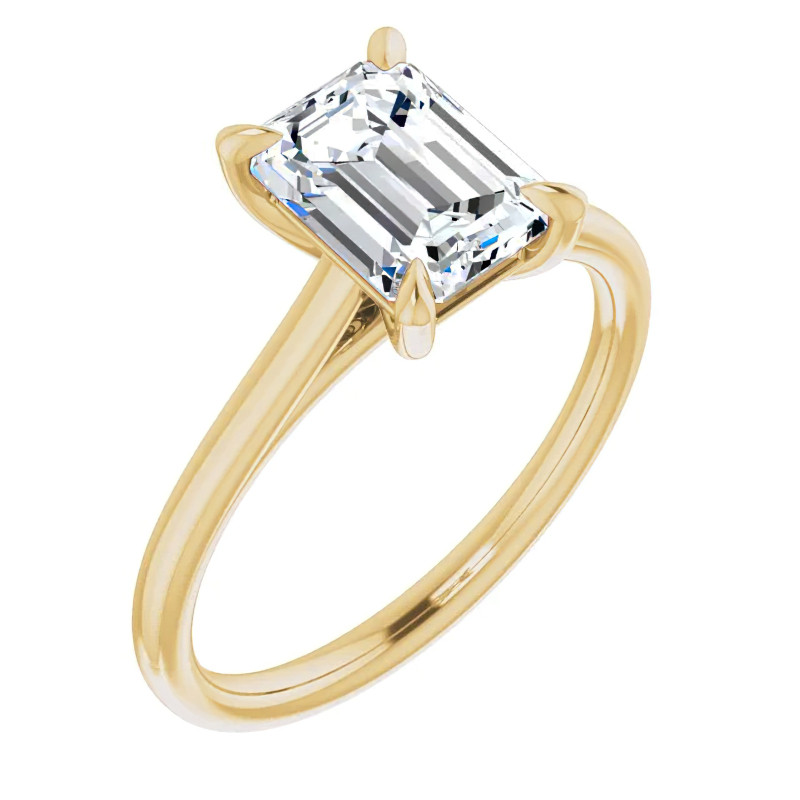 Introducing an exquisite solitaire engagement ring that radiates elegance and charm. The delicate cathedral design with claw shaped prongs is designed to accentuate the beauty of the center stone. Choose between the emerald or radiant cut Moissanite center stone to create the perfect ring for your unique taste.