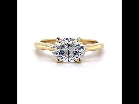 This beautiful solitaire ring features an oval cut Moissanite center stone, set east-west, and is available in your choice in 14k gold, 18k gold or platinum.