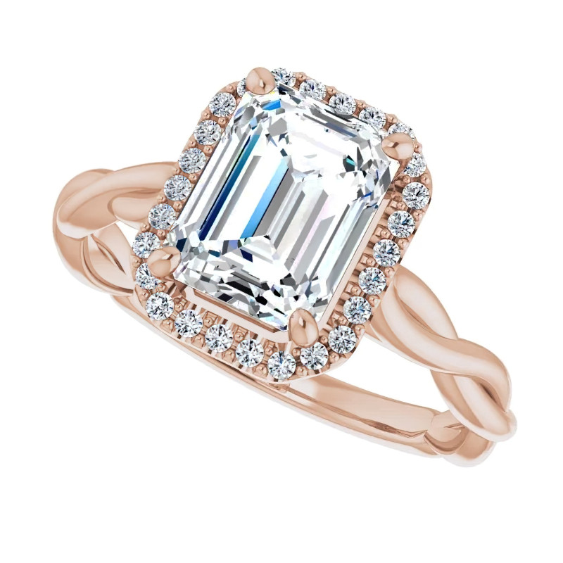 This beautiful Cathedral Halo and Infinity-Style engagement ring features your choice of an emerald or radiant cut colorless Moissanite center stone, 0.11ct - 0.19ct of VS, colorless diamond side stones, and is cast in your choice of 14k gold, 18k gold or platinum. Add an optional matching band to make it a wedding set.