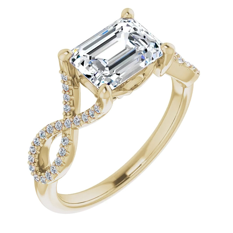 This beautiful Infinity East-West style engagement ring features your choice of an emerald or radiant cut colorless Moissanite center stone, 0.12ct - 0.38ct of VS, colorless diamond side stones, and is cast in your choice of 14k gold, 18k gold or platinum.