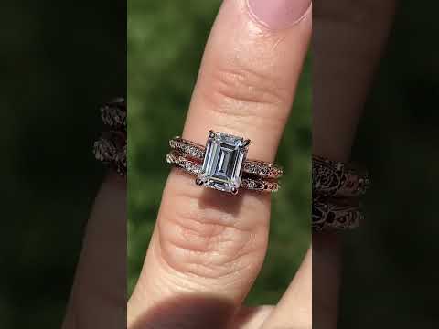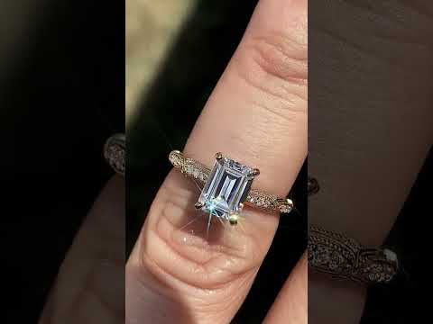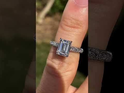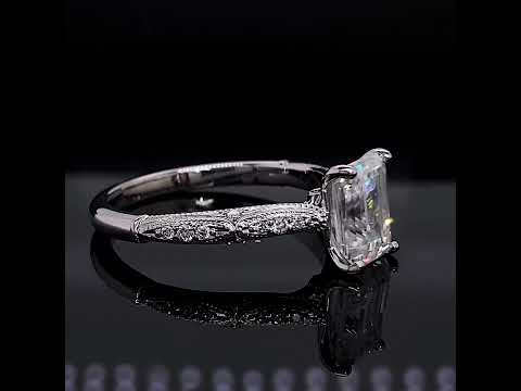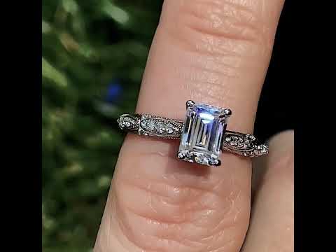 Experience the timeless allure of this exquisitely crafted antique-style engagement ring. Designed to perfection, this stunning ring features an emerald or radiant cut Moissanite center stone, paired with two bezel-set diamonds placed directly beneath it.