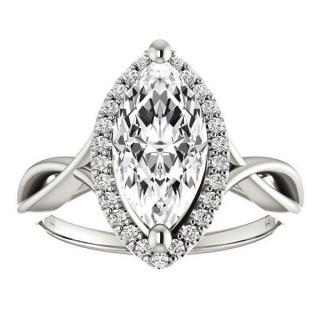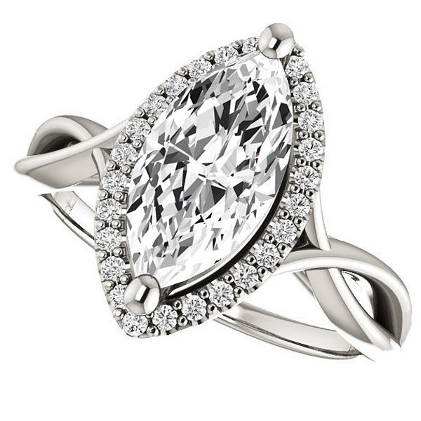 This beautiful engagement ring features a split-shank halo design, a marquise cut Moissanite center stone, 0.15ct - 0.27ct of diamond side stones, and is cast in your choice of 14k gold, 18k gold or platinum.