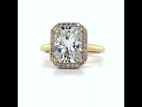 This cathedral design has a beautiful floral accent, a halo surrounding your choice of an emerald or radiant cut colorless Moissanite center stone, with 0.18ct - 0.30ct of VS, colorless diamond side stones, and is cast in your choice of 14k gold, 18k gold or platinum. Add an optional matching band to make it a wedding set.