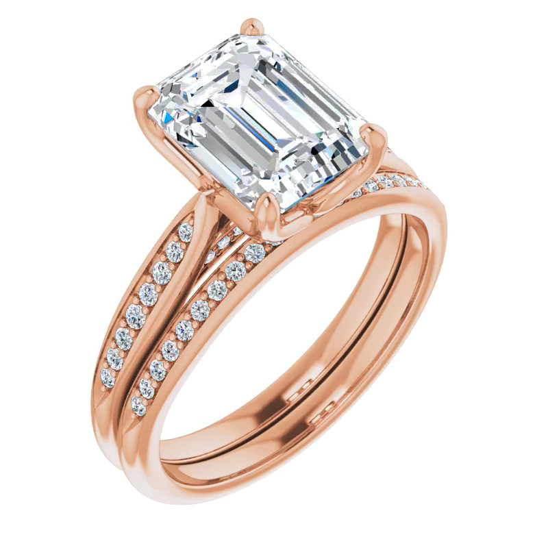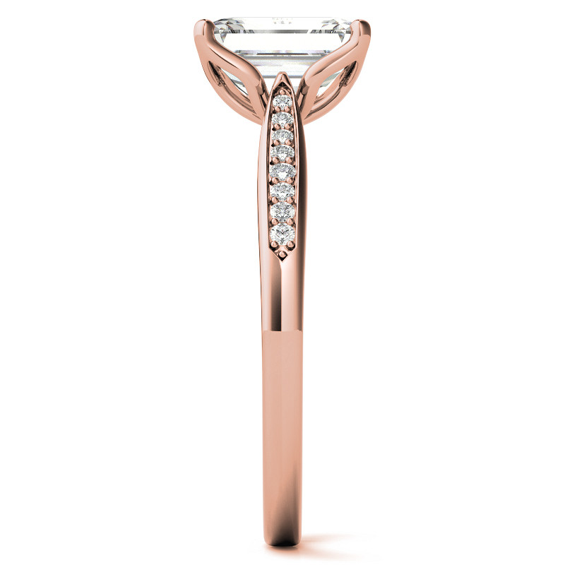 This cathedral designed engagement ring features a line of diamonds under the head with tapered side stones down the band, your choice of an emerald or radiant cut colorless Moissanite center stone, 0.14ct - 0.15ct of diamond side stones, and is cast in your choice of 14k gold, 18k gold or platinum. Add an optional matching band to make it a wedding set.