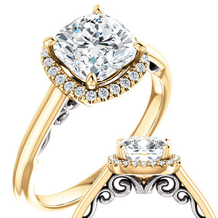 This two-toned engagement ring features a beautiful halo, a cushion cut colorless Moissanite center stone, 0.11ct - 0.15ct of diamond side stones, and is cast in your choice of 14k/18k gold, 14k/18k two-toned gold, or platinum.