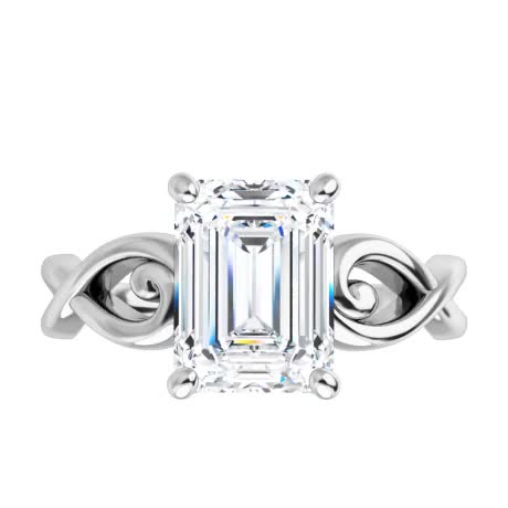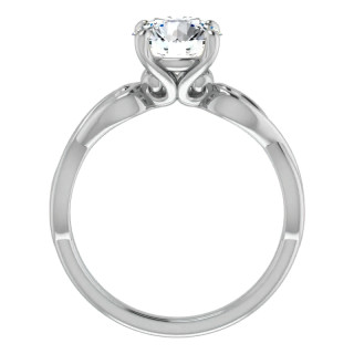 This beautiful Moissanite solitaire ring features a twisted, scroll design with a round brilliant Moissanite center stone and is set in your choice of 14k gold, 18k gold or platinum.