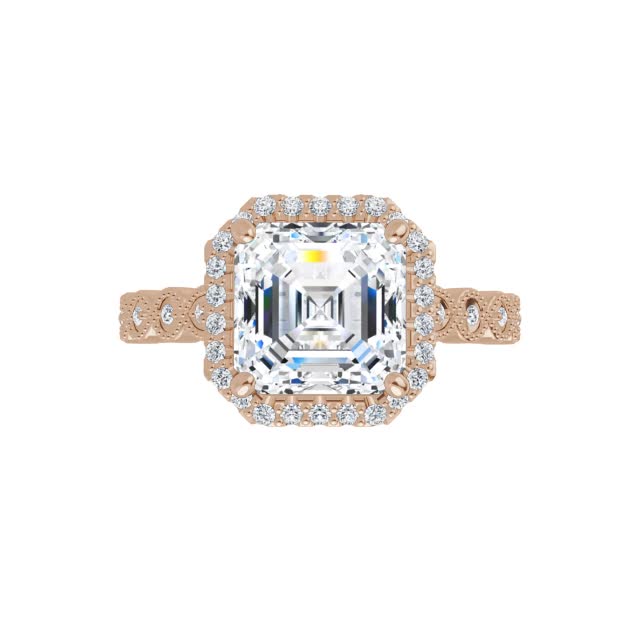 This beautiful Moissanite engagement ring features a scalloped halo design with milgrain accents, features an asscher cut colorless Moissanite center stone, 0.18 - 0.24ct of colorless Moissanite side stones, and is available in 14k gold, 18k gold or platinum. Add the optional matching band to make it a complete wedding set.