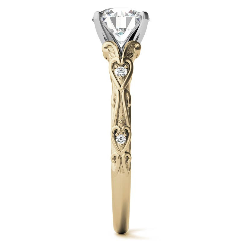 This beautiful Moissanite engagement ring features a split shank design with scroll accents, your choice of a colorless Moissanite center stone, and is available in 14k or 18k gold.
