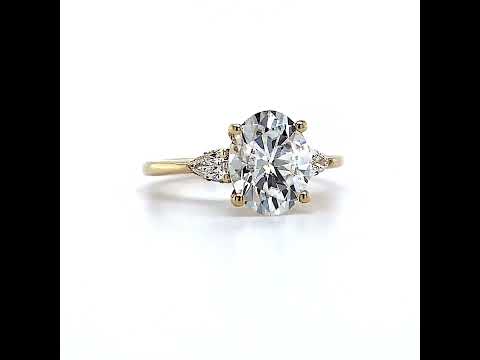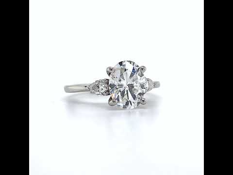This beautiful Moissanite engagement ring features a floral 3-stone design with an oval cut Moissanite center stone, two 4x2.5mm/0.12ct pear cut Moissanite side stones, and 0.05ct of round brilliant Moissanite side stones. Available in your choice of 14k gold, 18k gold, or platinum.