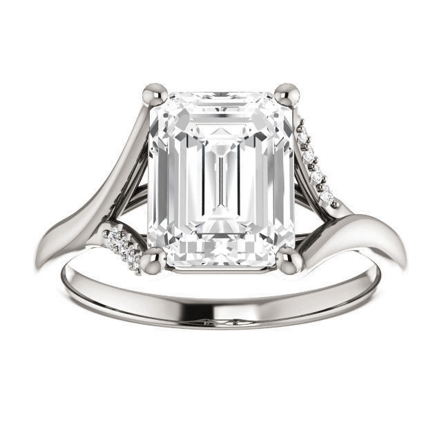 This beautiful Moissanite engagement ring features a diamond-accented cathedral design, an emerald or radiant cut colorless Moissanite center stone, and 0.02ct - 0.06ct of round brilliant colorless Moissanite accents. Available in your choice of 14k gold, 18k gold or platinum. Add the optional matching band to make this a complete bridal set