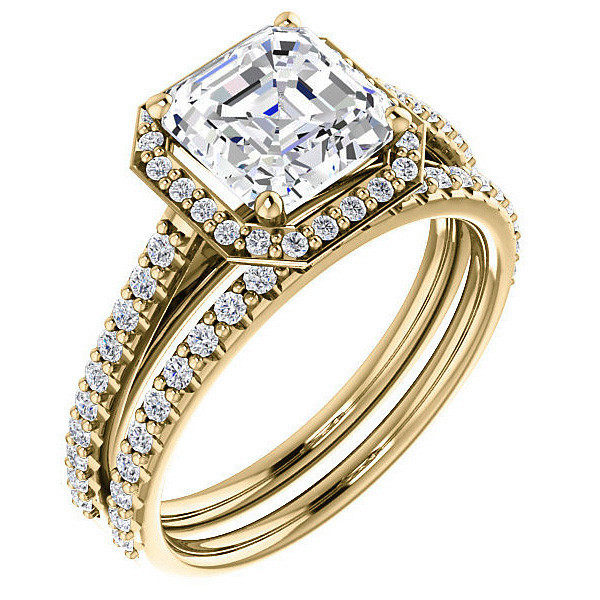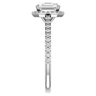 This beautiful engagement ring features a petite halo design, your choice of an asscher cut colorless Moissanite center stone, 0.30ct - 0.34ct round brilliant Moissanites, and is cast in 14k gold, 18k gold or platinum. It has an optional matching band with 0.23ct of round brilliant Moissanites.