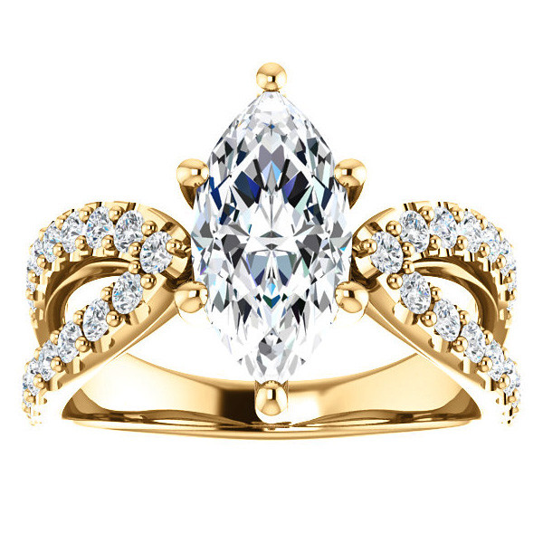 This beautiful engagement ring features a cathedral design with a marquise cut Moissanite center stone and 0.50ct of diamond side stones, set in your choice of 14k gold, 18k gold or platinum. Add the optional band to make it a complete wedding set.