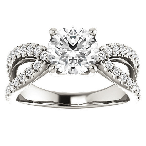 This beautiful engagement ring features a cathedral design with a Round cut Moissanite center stone and 0.50ct of colorless Moissanite side stones, set in your choice of 14k gold, 18k gold or platinum.