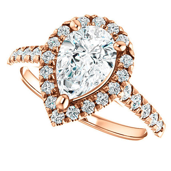 This beautiful engagement ring features a cathedral halo design, a pear cut Moissanite center stone and 0.50ct of round brilliant colorless Moissanite side stones, set in your choice of 14k gold, 18k gold or platinum.