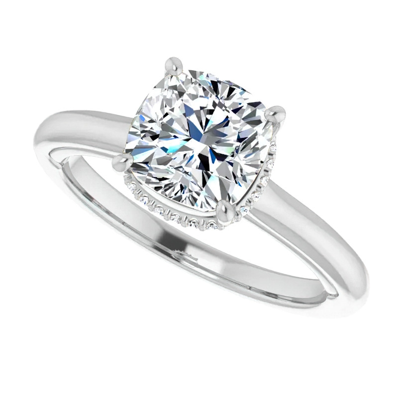 This beautiful solitaire ring features a thin band design with a cushion cut Moissanite center stone and 0.11ct of diamond side stones, set in your choice of 14k gold, 18k gold or platinum.