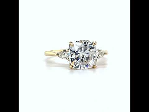 This beautiful engagement ring features a three-stone design with a cushion cut Moissanite colorless center stone and 0.25ct of Moissanite pear shaped side stones, set in your choice of 14k gold, 18k gold or platinum.
