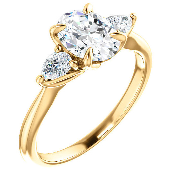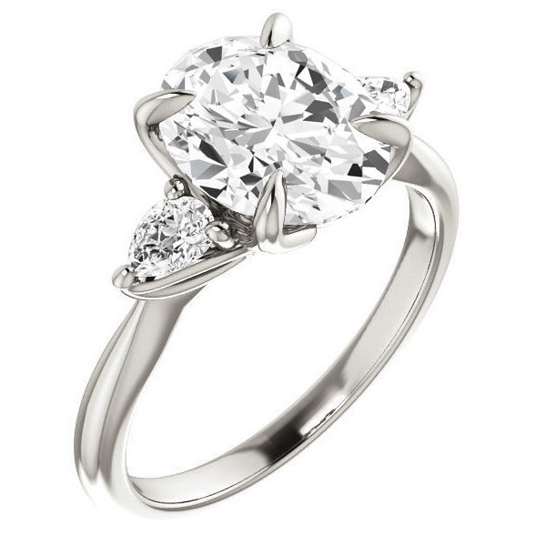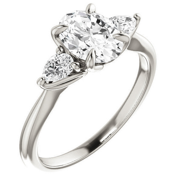 This beautiful engagement ring features a three-stone design with an oval cut Moissanite colorless center stone and 0.25ct of Moissanite pear shaped side stones, set in your choice of 14k gold, 18k gold or platinum.