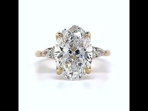 This beautiful engagement ring features a three-stone design with an oval cut Moissanite colorless center stone and 0.25ct of Moissanite pear shaped side stones, set in your choice of 14k gold, 18k gold or platinum.