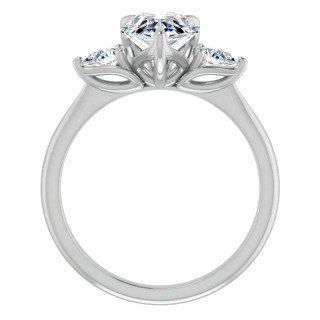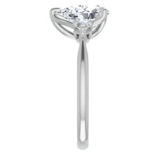 This beautiful engagement ring features a three-stone design with a pear cut Moissanite colorless center stone and 0.25ct of Moissanite pear shaped side stones, set in your choice of 14k gold, 18k gold or platinum.