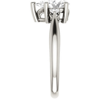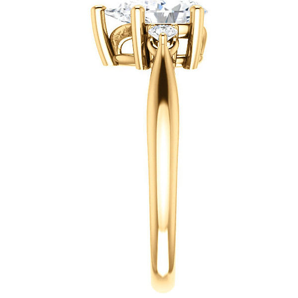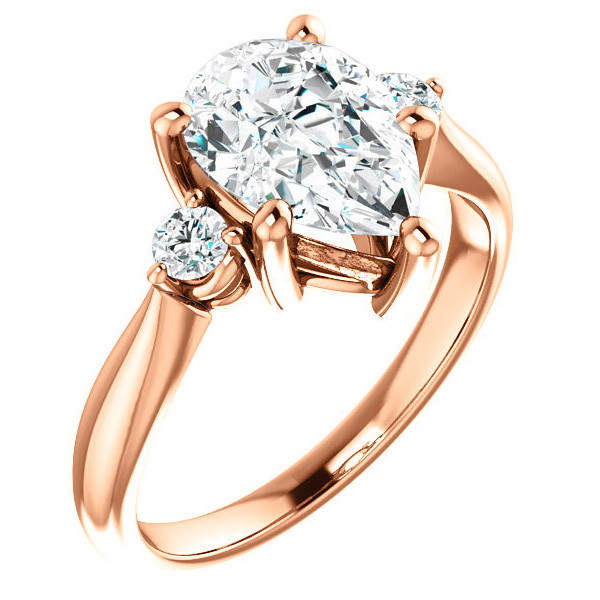 This beautiful engagement ring features a three-stone design with a Pear cut Moissanite colorless center stone and two Moissanite round side stones, set in your choice of 14k gold, 18k gold or platinum.