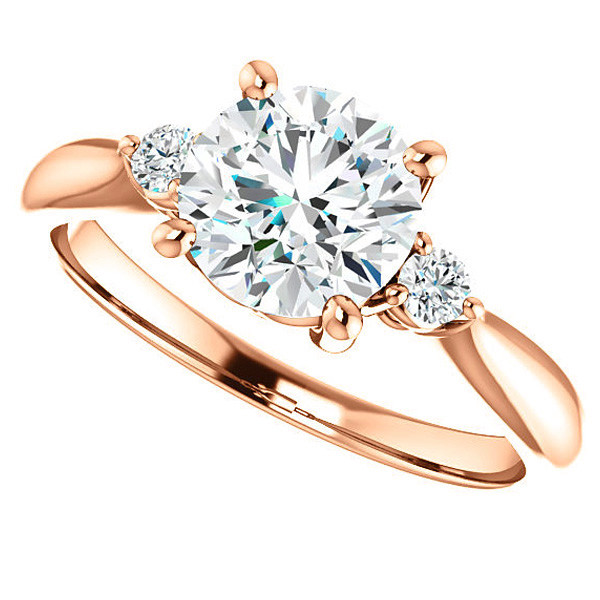 This beautiful engagement ring features a three-stone design with a round brilliant cut Moissanite colorless center stone and two Moissanite round side stones, set in your choice of 14k gold, 18k gold or platinum.