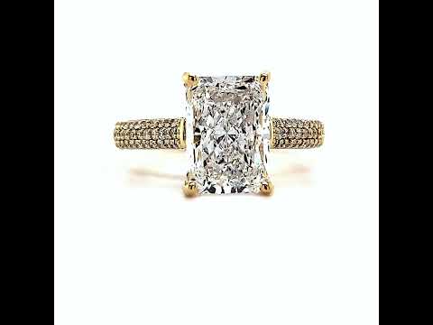 This beautiful engagement ring features a pave and cathedral design with an Emerald or Radiant cut Moissanite center stone and 0.40ct of diamond side stones, set in your choice of 14k gold, 18k gold or platinum.