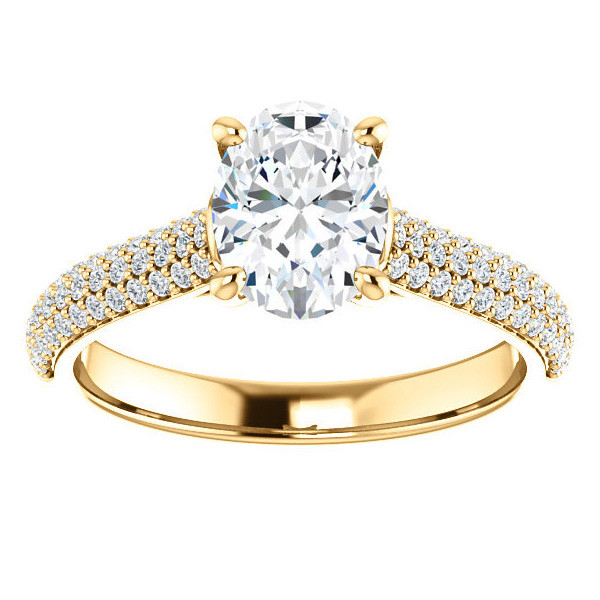 This beautiful engagement ring features a pave and cathedral design with a Oval cut Moissanite center stone and 0.40ct of diamond side stones, set in your choice of 14k gold, 18k gold or platinum.