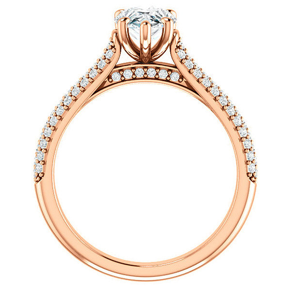 This beautiful engagement ring features a pave and cathedral design with a Pear cut Moissanite center stone and 0.40ct of diamond side stones, set in your choice of 14k gold, 18k gold or platinum.