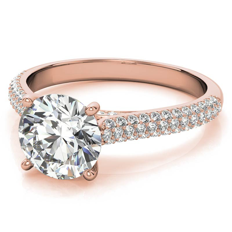 This beautiful engagement ring features a pave and cathedral design with a round brilliant cut Moissanite center stone and 0.40ct of diamond side stones, set in your choice of 14k gold, 18k gold or platinum.