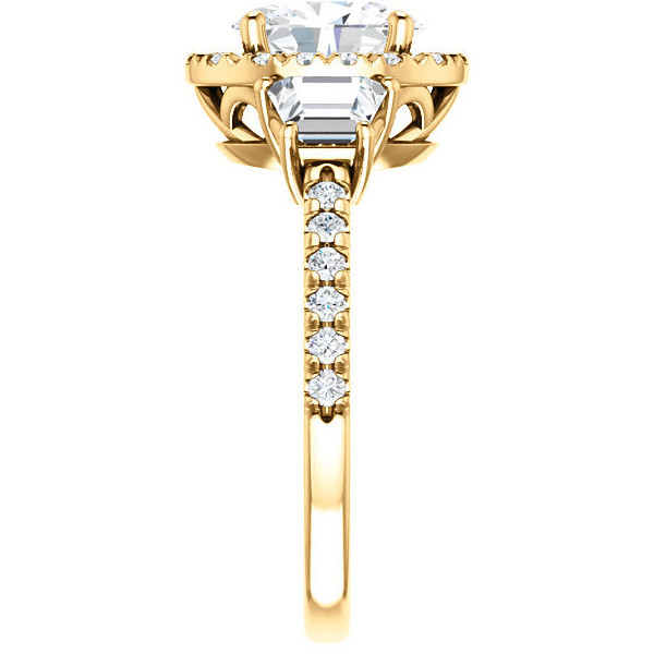 This beautiful engagement ring features a halo design with an oval cut Moissanite center stone, two 1/4ct each trapezoid cut Moissanite side stones, round brilliant Moissanite side stones, and is set in your choice of 14k gold, 18k gold or platinum.