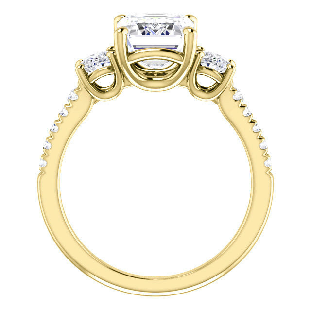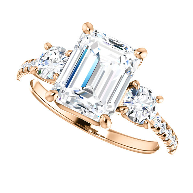 This beautiful engagement ring features a three stone design with an emerald or radiant cut Moissanite center stone and 0.66 - 0.80ct of colorless Moissanite side stones, set in your choice of 14k gold, 18k gold or platinum. Add the optional band to make it a complete wedding set.