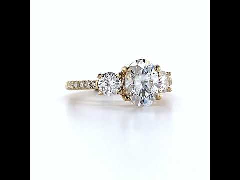 This beautiful engagement ring features a three stone design with an oval cut Moissanite center stone and 0.66ct - 0.80ct of colorless Moissanite side stones, set in your choice of 14k gold, 18k gold or platinum. Add the optional band to make it a complete wedding set.